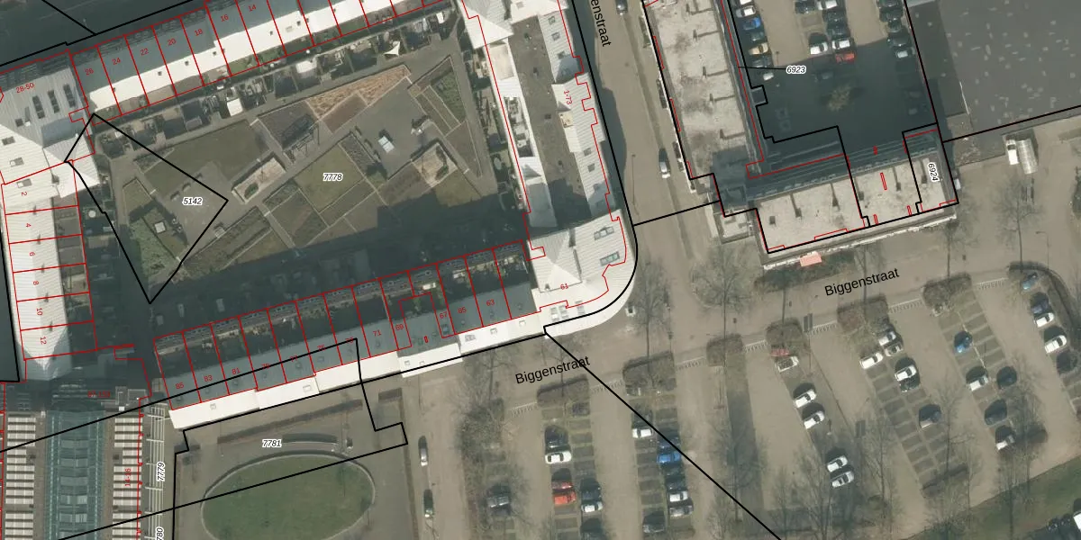 Het perceel waarop Biggenstraat 73 staat heeft een oppervlakte van 8022 m². Dit is een zeer groot perceel. De perceeloppervlakte wordt geregistreerd door het Kadaster. Gedetailleerde informatie over de maten van dit perceel kunt u vinden in het rapport Kadastrale kaart met maatvoering van Biggenstraat 73.