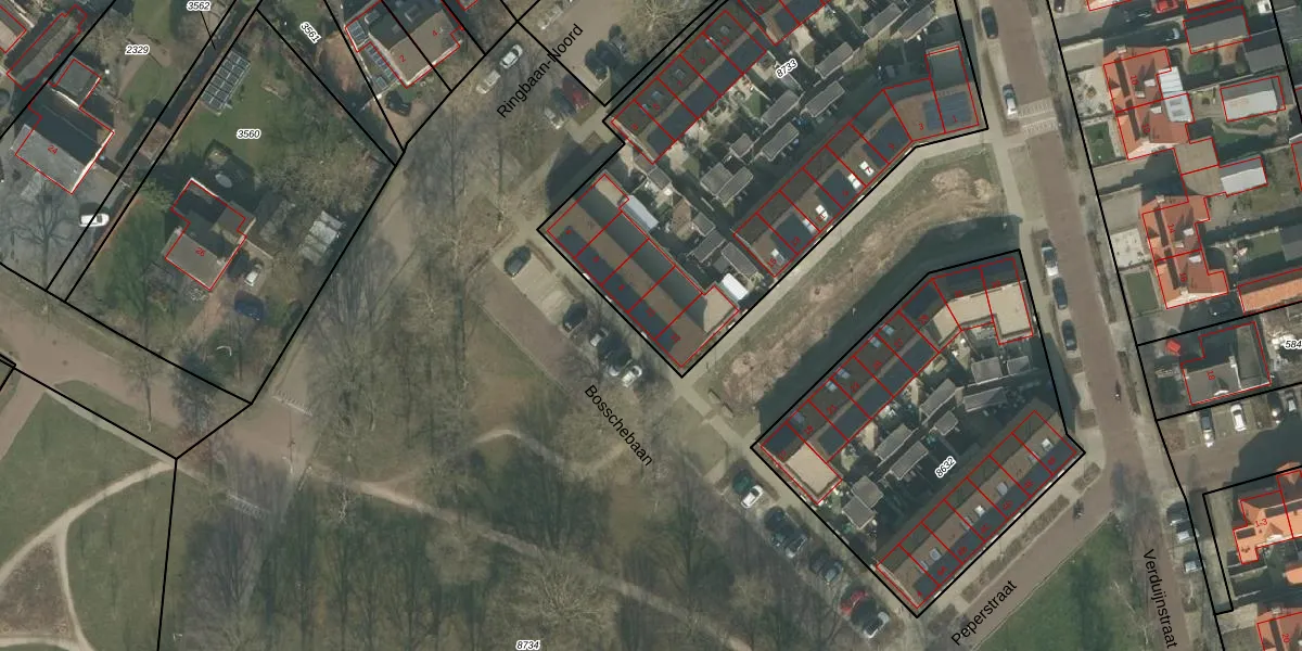 Het perceel waarop Bosschebaan 10 staat heeft een oppervlakte van 2570 m². Dit is een zeer groot perceel. De perceeloppervlakte wordt geregistreerd door het Kadaster. Gedetailleerde informatie over de maten van dit perceel kunt u vinden in het rapport Kadastrale kaart met maatvoering van Bosschebaan 10.