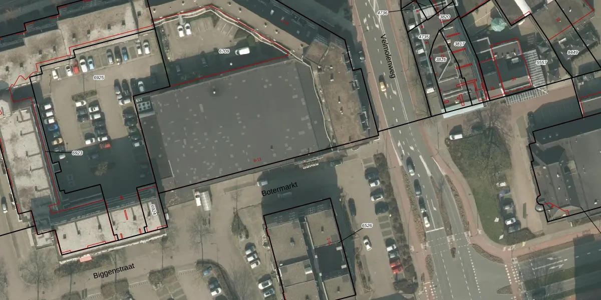 Het perceel waarop Botermarkt 9 staat heeft een oppervlakte van 4016 m². Dit is een zeer groot perceel. De perceeloppervlakte wordt geregistreerd door het Kadaster. Gedetailleerde informatie over de maten van dit perceel kunt u vinden in het rapport Kadastrale kaart met maatvoering van Botermarkt 9.