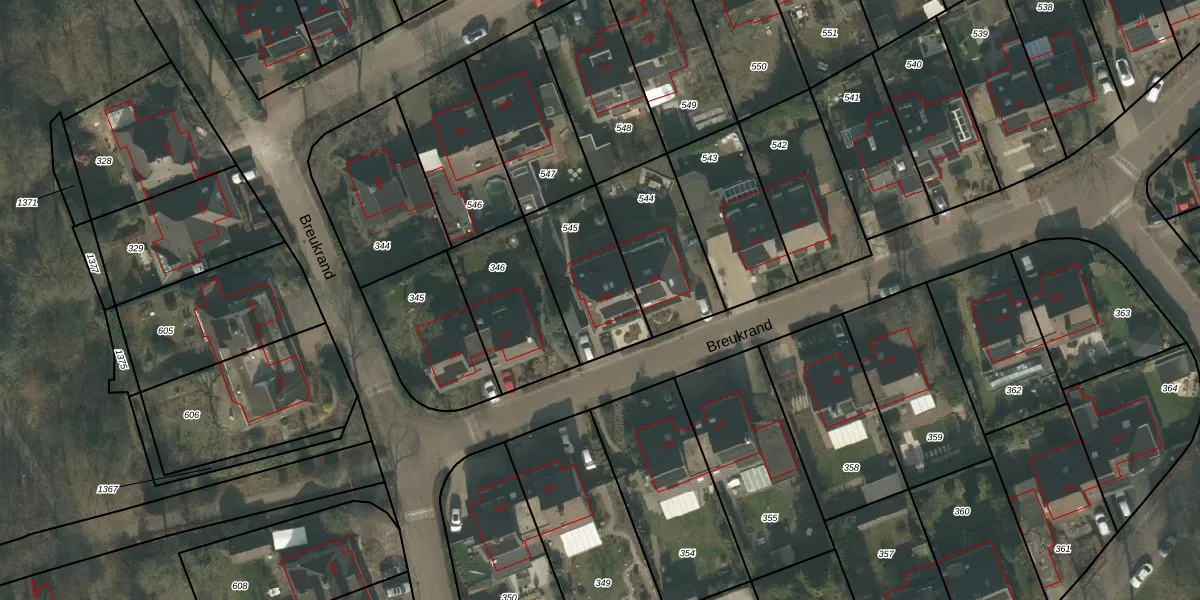 Het perceel waarop Breukrand 225 staat heeft een oppervlakte van 350 m². Dit is een groot perceel. De perceeloppervlakte wordt geregistreerd door het Kadaster. Gedetailleerde informatie over de maten van dit perceel kunt u vinden in het rapport Kadastrale kaart met maatvoering van Breukrand 225.