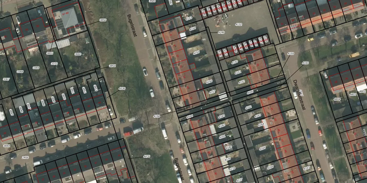 Het perceel waarop Bugelstraat 16 staat heeft een oppervlakte van 177 m². Dit is een middelgroot perceel. De perceeloppervlakte wordt geregistreerd door het Kadaster. Gedetailleerde informatie over de maten van dit perceel kunt u vinden in het rapport Kadastrale kaart met maatvoering van Bugelstraat 16.