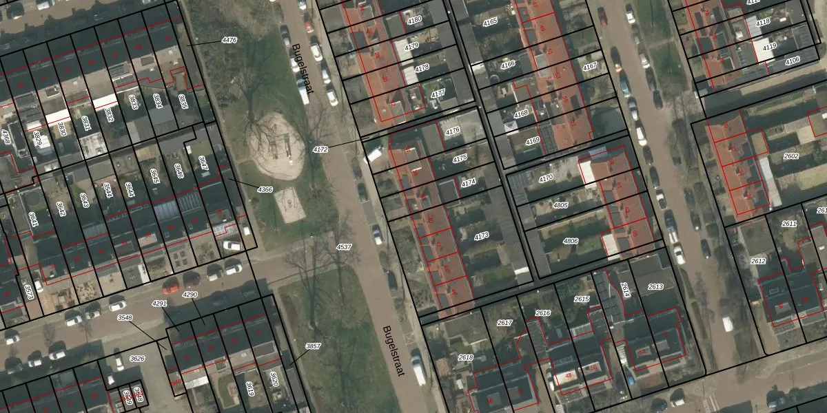 Het perceel waarop Bugelstraat 38 staat heeft een oppervlakte van 176 m². Dit is een middelgroot perceel. De perceeloppervlakte wordt geregistreerd door het Kadaster. Gedetailleerde informatie over de maten van dit perceel kunt u vinden in het rapport Kadastrale kaart met maatvoering van Bugelstraat 38.