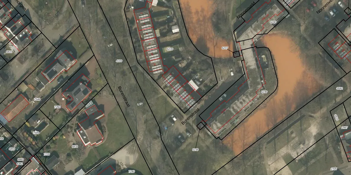 Het perceel waarop Burenstraat 16 staat heeft een oppervlakte van 2278 m². Dit is een zeer groot perceel. De perceeloppervlakte wordt geregistreerd door het Kadaster. Gedetailleerde informatie over de maten van dit perceel kunt u vinden in het rapport Kadastrale kaart met maatvoering van Burenstraat 16.