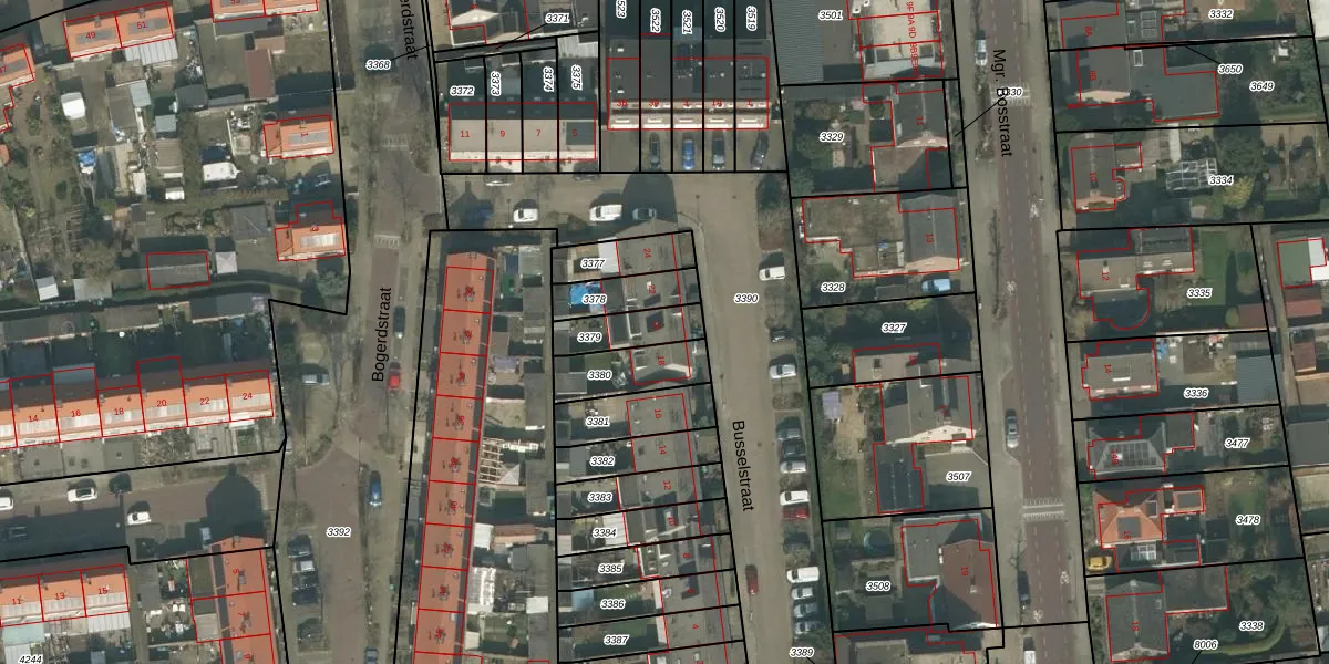 Gebruik de zoekbalk of klik op een perceel voor informatie over de adressen binnen dit perceel.