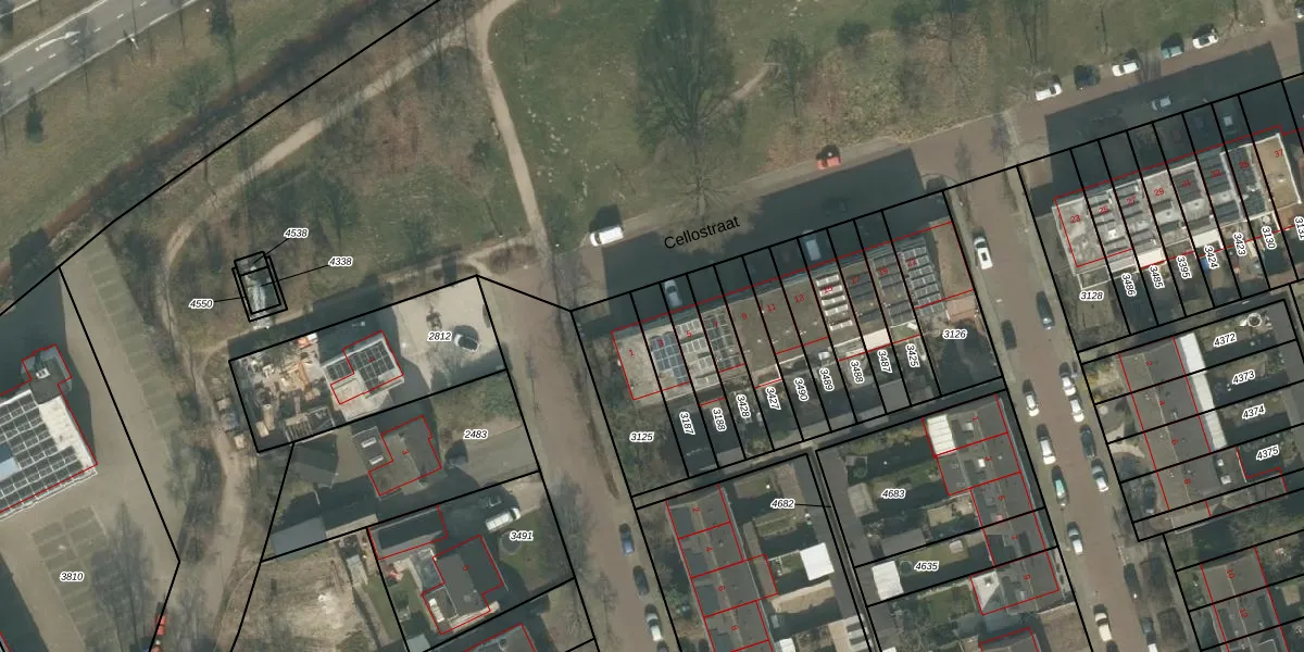 Cellostraat 3 is gelegen op kadastraal perceel UDN00B3187. Deze kadastrale aanduiding is uniek en wordt gebruikt door het Kadaster om eigendomsrechten en andere zakelijke rechten vast te leggen. Het perceel maakt onderdeel uit van de kadastrale gemeente Uden.