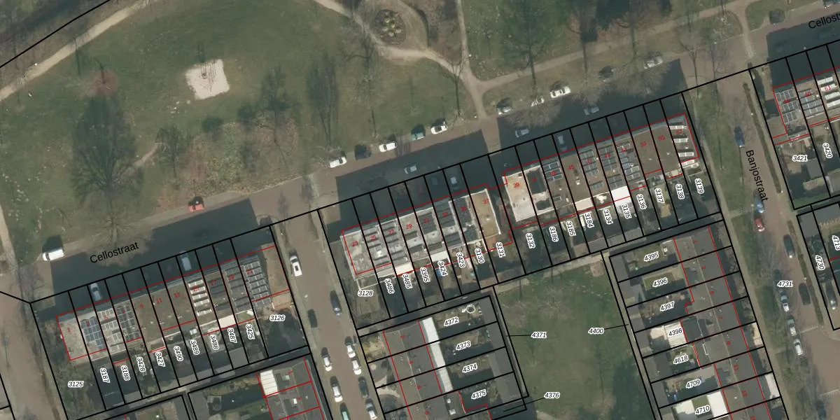 Cellostraat 31 is gelegen op kadastraal perceel UDN00B3424. Deze kadastrale aanduiding is uniek en wordt gebruikt door het Kadaster om eigendomsrechten en andere zakelijke rechten vast te leggen. Het perceel maakt onderdeel uit van de kadastrale gemeente Uden.