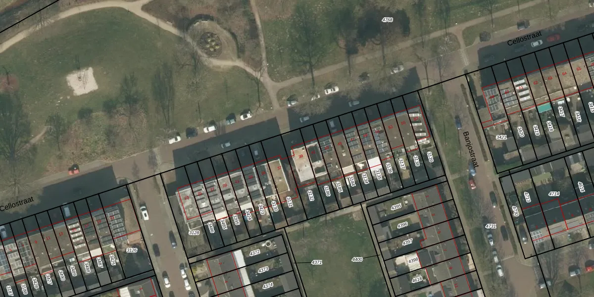 Cellostraat 39 is gelegen op kadastraal perceel UDN00B3132. Deze kadastrale aanduiding is uniek en wordt gebruikt door het Kadaster om eigendomsrechten en andere zakelijke rechten vast te leggen. Het perceel maakt onderdeel uit van de kadastrale gemeente Uden.