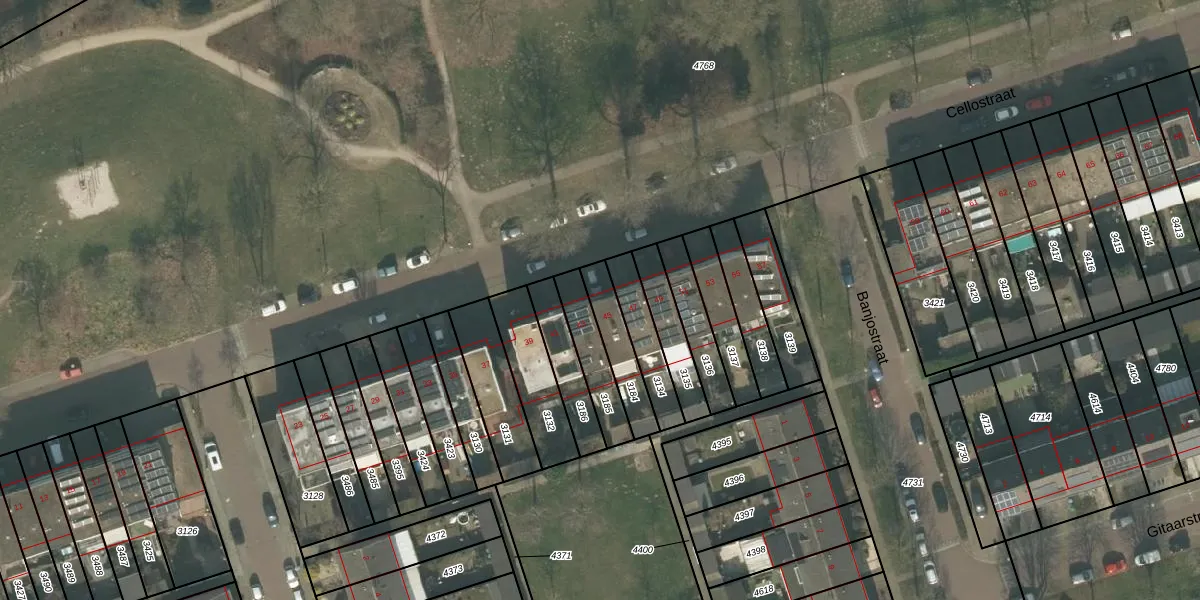 Cellostraat 45 is gelegen op kadastraal perceel UDN00B3184. Deze kadastrale aanduiding is uniek en wordt gebruikt door het Kadaster om eigendomsrechten en andere zakelijke rechten vast te leggen. Het perceel maakt onderdeel uit van de kadastrale gemeente Uden.