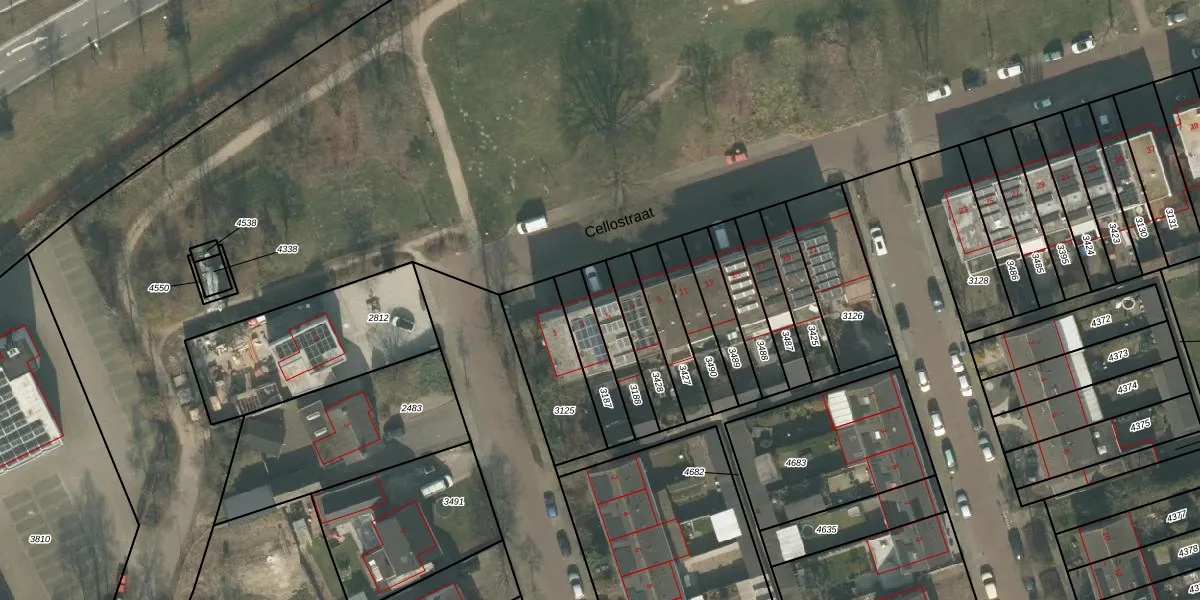 Cellostraat 5 is gelegen op kadastraal perceel UDN00B3188. Deze kadastrale aanduiding is uniek en wordt gebruikt door het Kadaster om eigendomsrechten en andere zakelijke rechten vast te leggen. Het perceel maakt onderdeel uit van de kadastrale gemeente Uden.