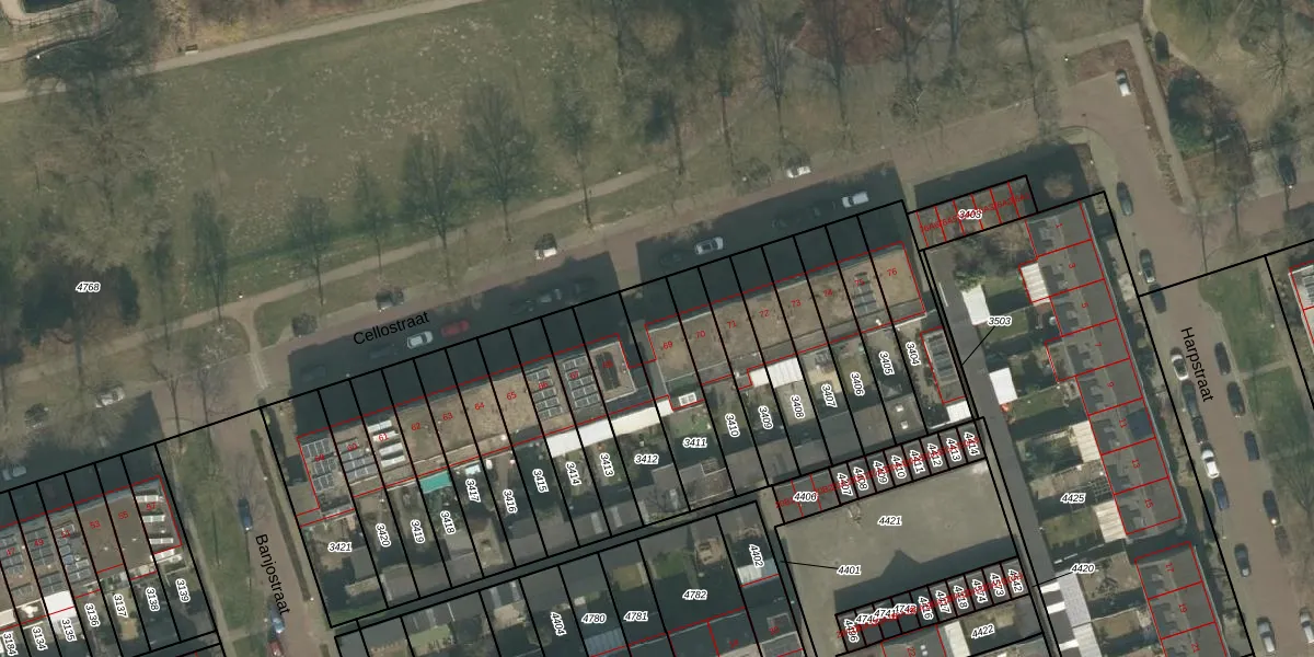 Het perceel waarop Cellostraat 69 staat heeft een oppervlakte van 261 m². Dit is een middelgroot perceel. De perceeloppervlakte wordt geregistreerd door het Kadaster. Gedetailleerde informatie over de maten van dit perceel kunt u vinden in het rapport Kadastrale kaart met maatvoering van Cellostraat 69.