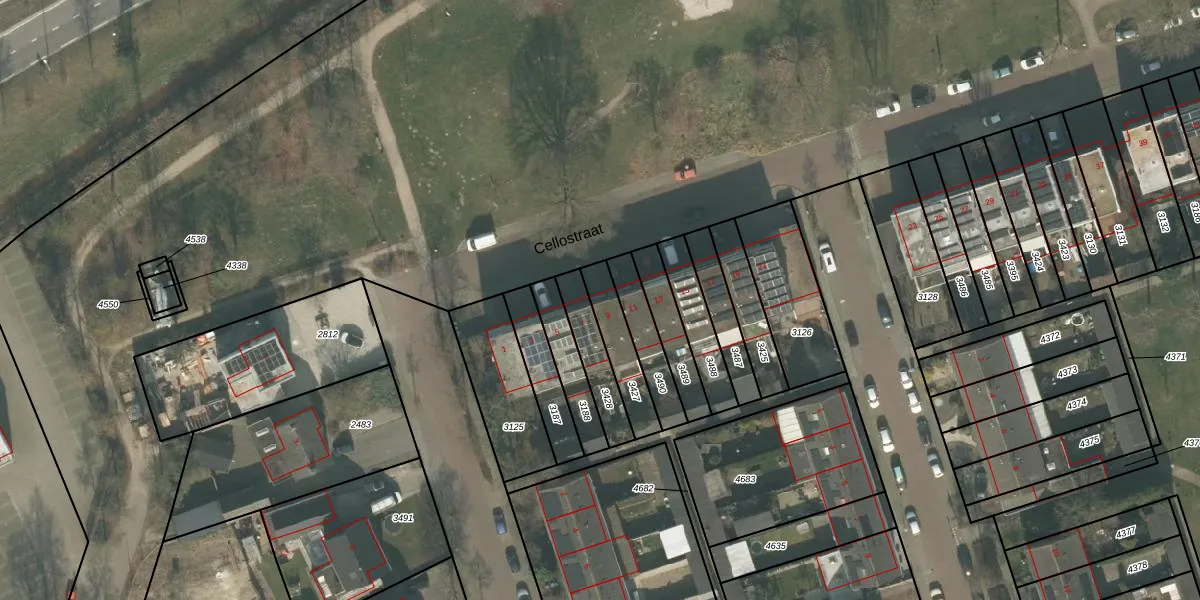 Cellostraat 9 is gelegen op kadastraal perceel UDN00B3427. Deze kadastrale aanduiding is uniek en wordt gebruikt door het Kadaster om eigendomsrechten en andere zakelijke rechten vast te leggen. Het perceel maakt onderdeel uit van de kadastrale gemeente Uden.