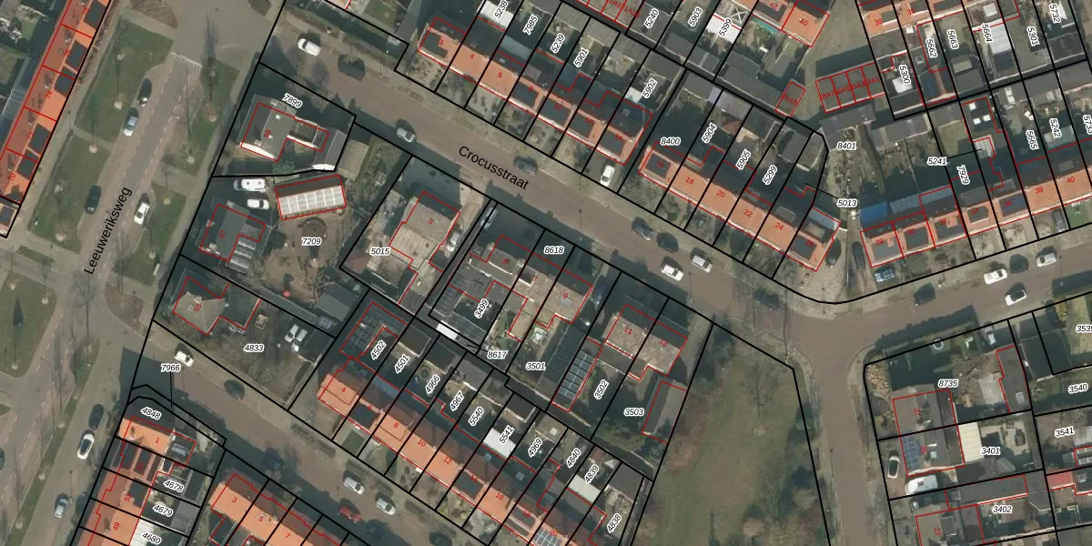 Het perceel waarop Crocusstraat 7 staat heeft een oppervlakte van 166 m². Dit is een middelgroot perceel. De perceeloppervlakte wordt geregistreerd door het Kadaster. Gedetailleerde informatie over de maten van dit perceel kunt u vinden in het rapport Kadastrale kaart met maatvoering van Crocusstraat 7.