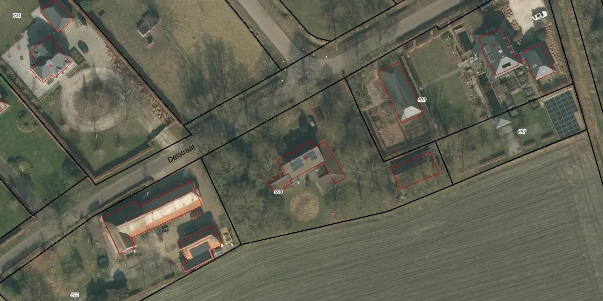 Het perceel waarop Delstraat 9 staat heeft een oppervlakte van 2429 m². Dit is een zeer groot perceel. De perceeloppervlakte wordt geregistreerd door het Kadaster. Gedetailleerde informatie over de maten van dit perceel kunt u vinden in het rapport Kadastrale kaart met maatvoering van Delstraat 9.