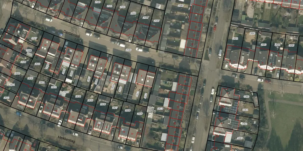 Het perceel waarop Dertienvat 1 staat heeft een oppervlakte van 152 m². Dit is een middelgroot perceel. De perceeloppervlakte wordt geregistreerd door het Kadaster. Gedetailleerde informatie over de maten van dit perceel kunt u vinden in het rapport Kadastrale kaart met maatvoering van Dertienvat 1.