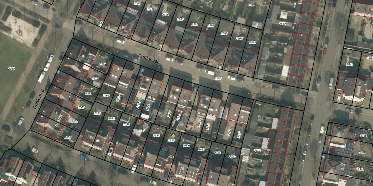 Het perceel waarop Dertienvat 9 staat heeft een oppervlakte van 228 m². Dit is een middelgroot perceel. De perceeloppervlakte wordt geregistreerd door het Kadaster. Gedetailleerde informatie over de maten van dit perceel kunt u vinden in het rapport Kadastrale kaart met maatvoering van Dertienvat 9.