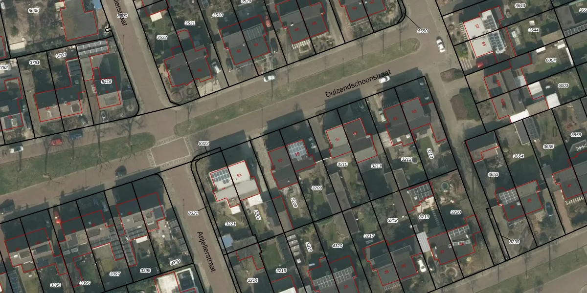 Het perceel waarop Duizendschoonstraat 55 staat heeft een oppervlakte van 360 m². Dit is een groot perceel. De perceeloppervlakte wordt geregistreerd door het Kadaster. Gedetailleerde informatie over de maten van dit perceel kunt u vinden in het rapport Kadastrale kaart met maatvoering van Duizendschoonstraat 55.