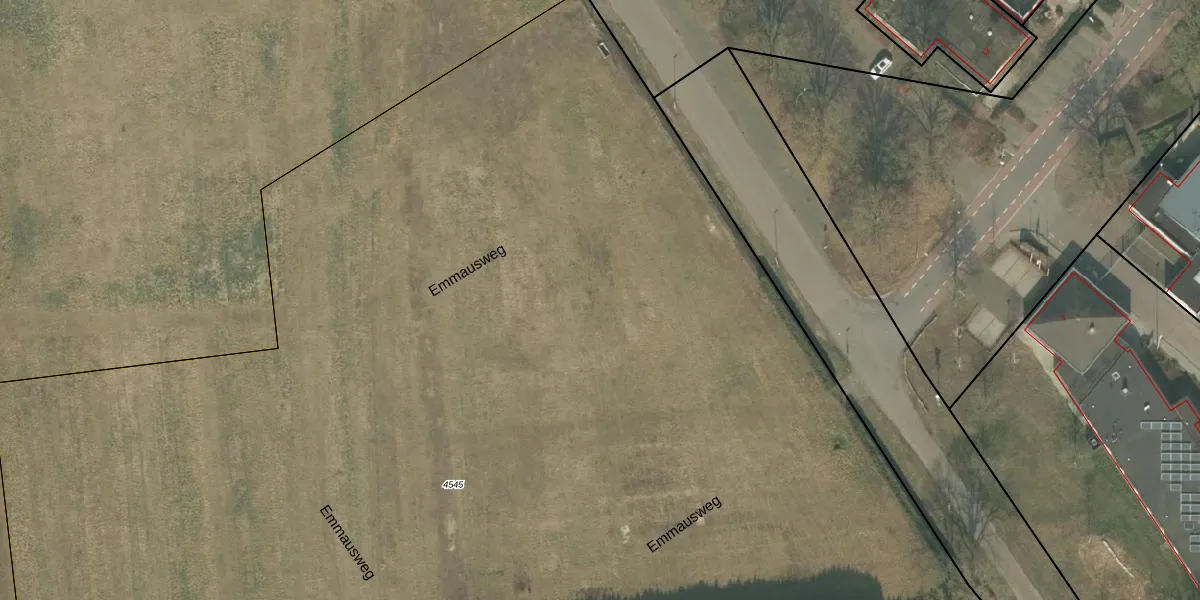 Het perceel waarop Emmausweg 45 staat heeft een oppervlakte van 1,3 ha. Dit is een zeer groot perceel. De perceeloppervlakte wordt geregistreerd door het Kadaster. Gedetailleerde informatie over de maten van dit perceel kunt u vinden in het rapport Kadastrale kaart met maatvoering van Emmausweg 45.