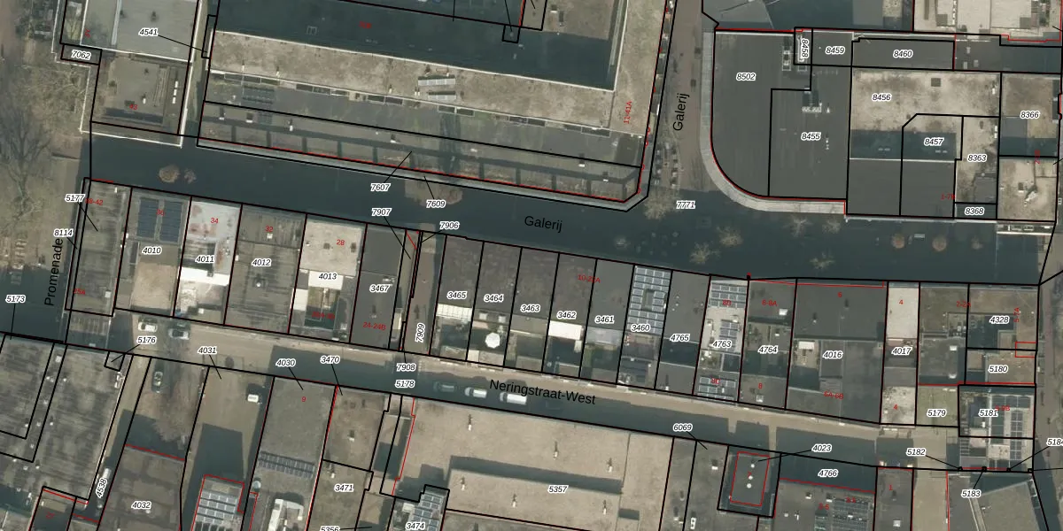 Het perceel waarop Galerij 18 staat heeft een oppervlakte van 165 m². Dit is een middelgroot perceel. De perceeloppervlakte wordt geregistreerd door het Kadaster. Gedetailleerde informatie over de maten van dit perceel kunt u vinden in het rapport Kadastrale kaart met maatvoering van Galerij 18.