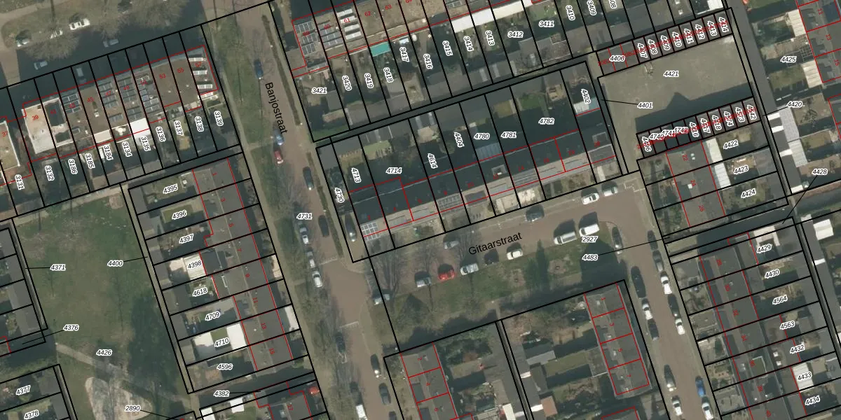 Gitaarstraat 6 is gelegen op kadastraal perceel UDN00B4714. Deze kadastrale aanduiding is uniek en wordt gebruikt door het Kadaster om eigendomsrechten en andere zakelijke rechten vast te leggen. Het perceel maakt onderdeel uit van de kadastrale gemeente Uden.