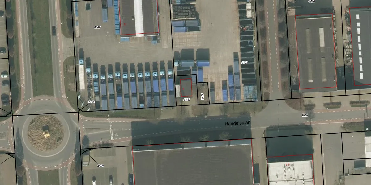 Handelslaan 2 is gelegen op kadastraal perceel UDN00C4386. Deze kadastrale aanduiding is uniek en wordt gebruikt door het Kadaster om eigendomsrechten en andere zakelijke rechten vast te leggen. Het perceel maakt onderdeel uit van de kadastrale gemeente Uden.