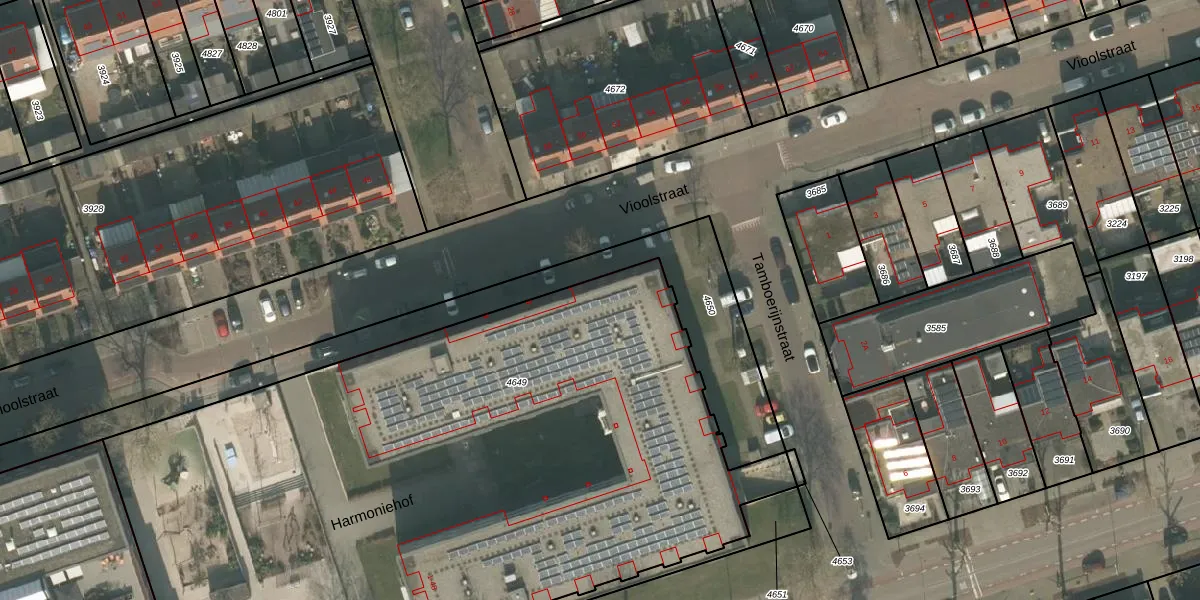 Het perceel waarop Harmoniehof 38 staat heeft een oppervlakte van 4845 m². Dit is een zeer groot perceel. De perceeloppervlakte wordt geregistreerd door het Kadaster. Gedetailleerde informatie over de maten van dit perceel kunt u vinden in het rapport Kadastrale kaart met maatvoering van Harmoniehof 38.