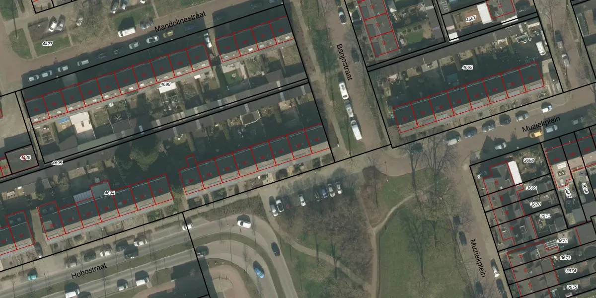 Het perceel waarop Hobostraat 46 staat heeft een oppervlakte van 4204 m². Dit is een zeer groot perceel. De perceeloppervlakte wordt geregistreerd door het Kadaster. Gedetailleerde informatie over de maten van dit perceel kunt u vinden in het rapport Kadastrale kaart met maatvoering van Hobostraat 46.