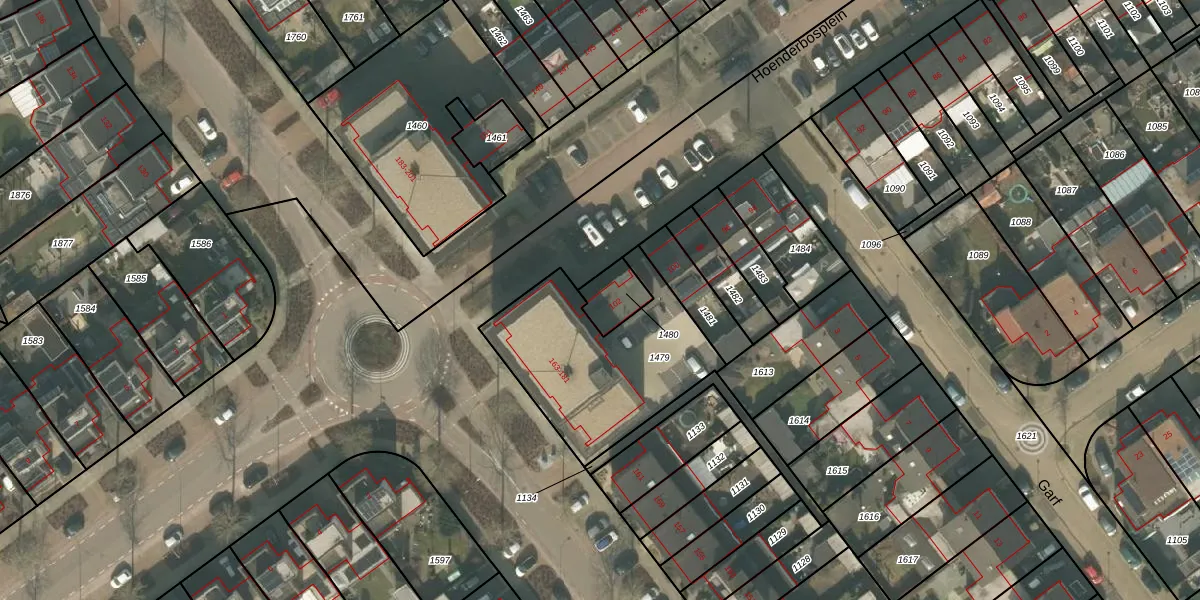 Hoenderbosplein 102 is gelegen op kadastraal perceel UDN00P1480. Deze kadastrale aanduiding is uniek en wordt gebruikt door het Kadaster om eigendomsrechten en andere zakelijke rechten vast te leggen. Het perceel maakt onderdeel uit van de kadastrale gemeente Uden.