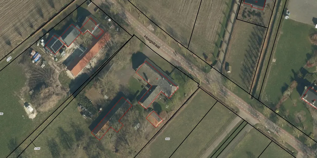Het perceel waarop Hoogstraat 9 staat heeft een oppervlakte van 1,3 ha. Dit is een zeer groot perceel. De perceeloppervlakte wordt geregistreerd door het Kadaster. Gedetailleerde informatie over de maten van dit perceel kunt u vinden in het rapport Kadastrale kaart met maatvoering van Hoogstraat 9.