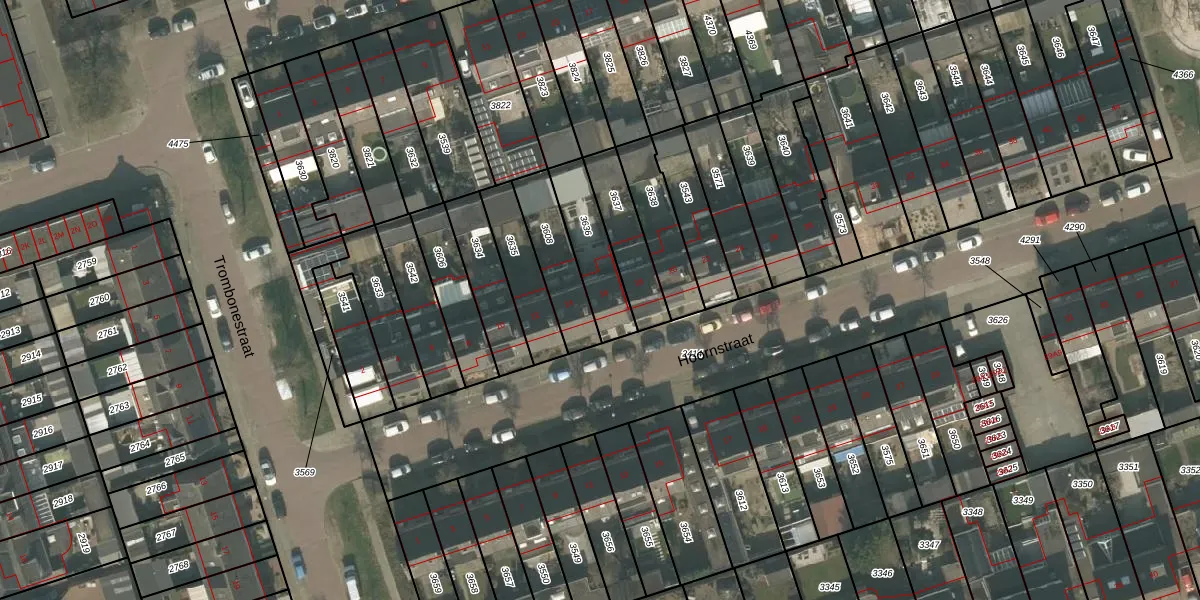 Het perceel waarop Hoornstraat 16 staat heeft een oppervlakte van 184 m². Dit is een middelgroot perceel. De perceeloppervlakte wordt geregistreerd door het Kadaster. Gedetailleerde informatie over de maten van dit perceel kunt u vinden in het rapport Kadastrale kaart met maatvoering van Hoornstraat 16.