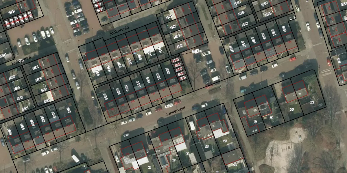 Jonkerveld 714 is gelegen op kadastraal perceel UDN00N2800. Deze kadastrale aanduiding is uniek en wordt gebruikt door het Kadaster om eigendomsrechten en andere zakelijke rechten vast te leggen. Het perceel maakt onderdeel uit van de kadastrale gemeente Uden.