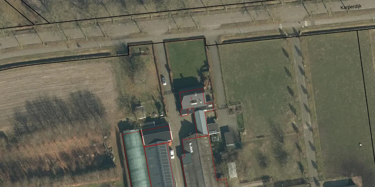 Het perceel waarop Karperdijk 3 staat heeft een oppervlakte van 3,3 ha. Dit is een zeer groot perceel. De perceeloppervlakte wordt geregistreerd door het Kadaster. Gedetailleerde informatie over de maten van dit perceel kunt u vinden in het rapport Kadastrale kaart met maatvoering van Karperdijk 3.