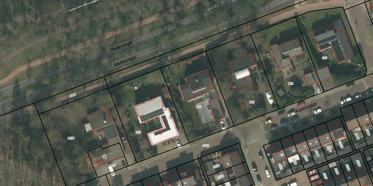 Het perceel waarop Keizershof 106 staat heeft een oppervlakte van 1107 m². Dit is een zeer groot perceel. De perceeloppervlakte wordt geregistreerd door het Kadaster. Gedetailleerde informatie over de maten van dit perceel kunt u vinden in het rapport Kadastrale kaart met maatvoering van Keizershof 106.