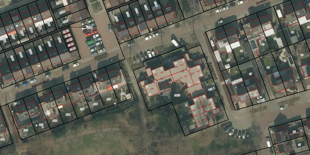 Het perceel waarop Keizershof 737 staat heeft een oppervlakte van 2100 m². Dit is een zeer groot perceel. De perceeloppervlakte wordt geregistreerd door het Kadaster. Gedetailleerde informatie over de maten van dit perceel kunt u vinden in het rapport Kadastrale kaart met maatvoering van Keizershof 737.