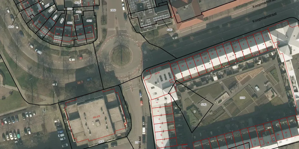 Het perceel waarop Koopmanstraat 40 staat heeft een oppervlakte van 8022 m². Dit is een zeer groot perceel. De perceeloppervlakte wordt geregistreerd door het Kadaster. Gedetailleerde informatie over de maten van dit perceel kunt u vinden in het rapport Kadastrale kaart met maatvoering van Koopmanstraat 40.