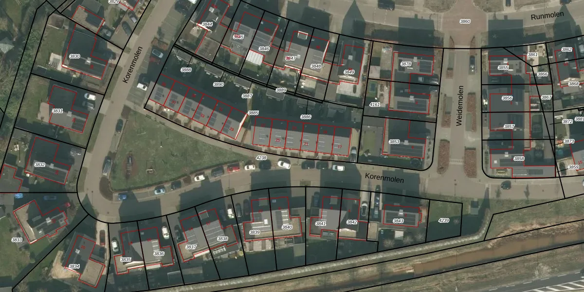 Het perceel waarop Korenmolen 23 staat heeft een oppervlakte van 1578 m². Dit is een zeer groot perceel. De perceeloppervlakte wordt geregistreerd door het Kadaster. Gedetailleerde informatie over de maten van dit perceel kunt u vinden in het rapport Kadastrale kaart met maatvoering van Korenmolen 23.