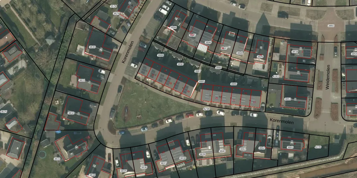 Het perceel waarop Korenmolen 31 staat heeft een oppervlakte van 1578 m². Dit is een zeer groot perceel. De perceeloppervlakte wordt geregistreerd door het Kadaster. Gedetailleerde informatie over de maten van dit perceel kunt u vinden in het rapport Kadastrale kaart met maatvoering van Korenmolen 31.