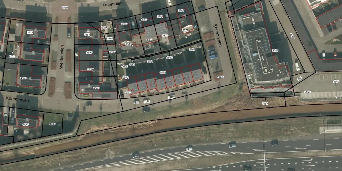 Het perceel waarop Korenmolen 7 staat heeft een oppervlakte van 1227 m². Dit is een zeer groot perceel. De perceeloppervlakte wordt geregistreerd door het Kadaster. Gedetailleerde informatie over de maten van dit perceel kunt u vinden in het rapport Kadastrale kaart met maatvoering van Korenmolen 7.