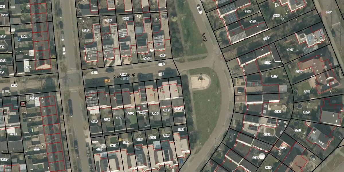Het perceel waarop Koreschoep 15 staat heeft een oppervlakte van 201 m². Dit is een middelgroot perceel. De perceeloppervlakte wordt geregistreerd door het Kadaster. Gedetailleerde informatie over de maten van dit perceel kunt u vinden in het rapport Kadastrale kaart met maatvoering van Koreschoep 15.