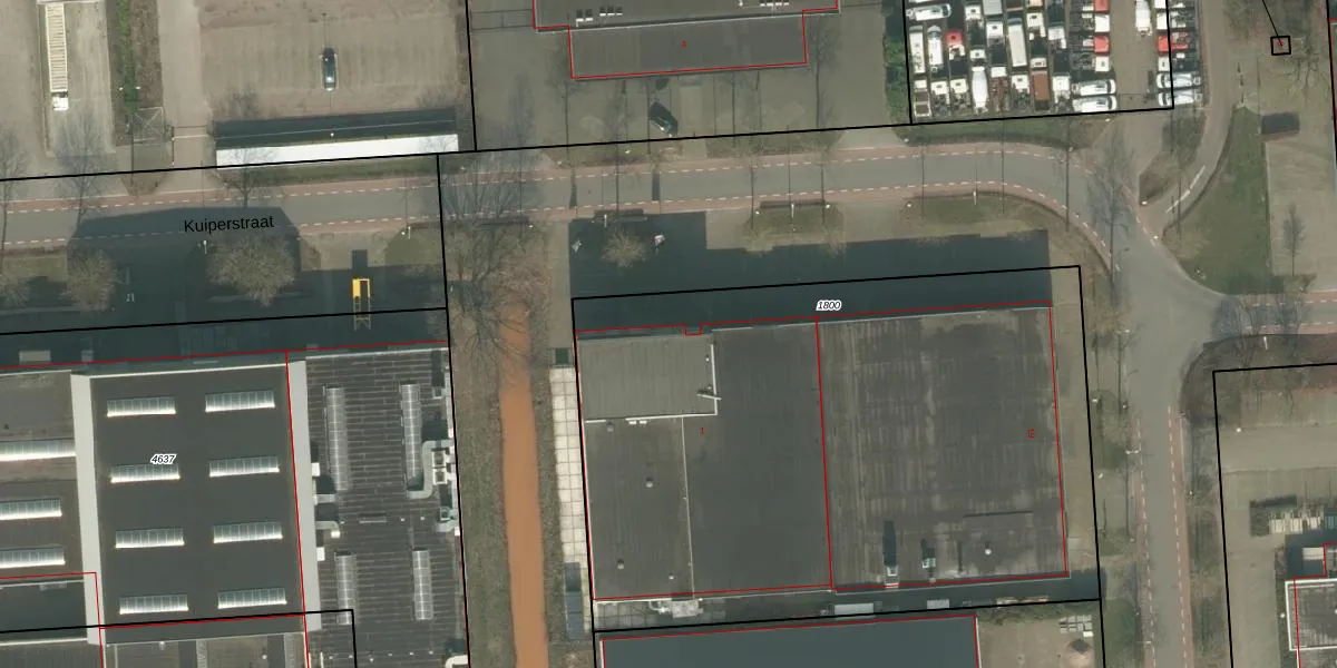 Het perceel waarop Kuiperstraat 1 staat heeft een oppervlakte van 3800 m². Dit is een zeer groot perceel. De perceeloppervlakte wordt geregistreerd door het Kadaster. Gedetailleerde informatie over de maten van dit perceel kunt u vinden in het rapport Kadastrale kaart met maatvoering van Kuiperstraat 1.