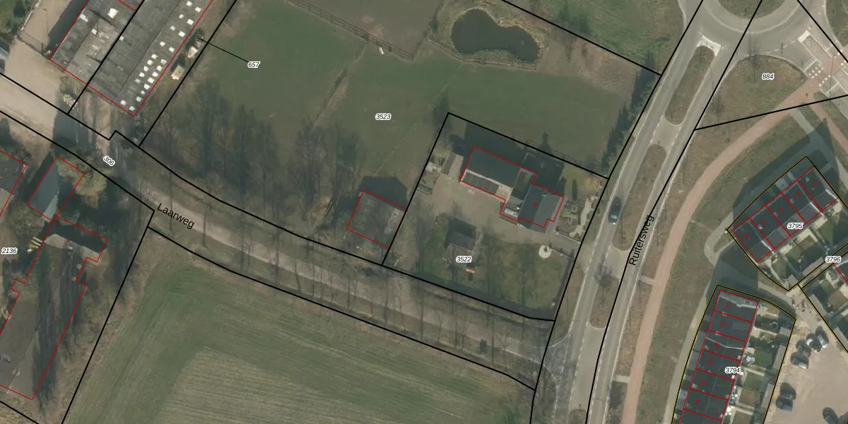 Laarweg 2 is gelegen op kadastraal perceel UDN00P3522. Deze kadastrale aanduiding is uniek en wordt gebruikt door het Kadaster om eigendomsrechten en andere zakelijke rechten vast te leggen. Het perceel maakt onderdeel uit van de kadastrale gemeente Uden.
