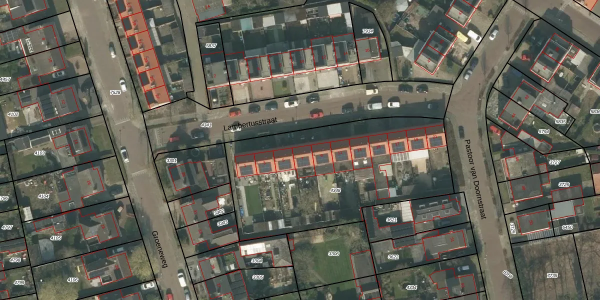 Het perceel waarop Lambertusstraat 7 staat heeft een oppervlakte van 2277 m². Dit is een zeer groot perceel. De perceeloppervlakte wordt geregistreerd door het Kadaster. Gedetailleerde informatie over de maten van dit perceel kunt u vinden in het rapport Kadastrale kaart met maatvoering van Lambertusstraat 7.