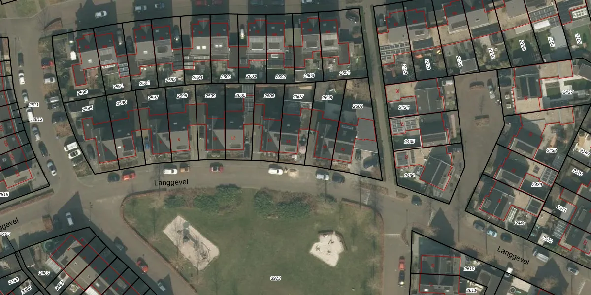 Langgevel 16 is gelegen op kadastraal perceel UDN00P2607. Deze kadastrale aanduiding is uniek en wordt gebruikt door het Kadaster om eigendomsrechten en andere zakelijke rechten vast te leggen. Het perceel maakt onderdeel uit van de kadastrale gemeente Uden.