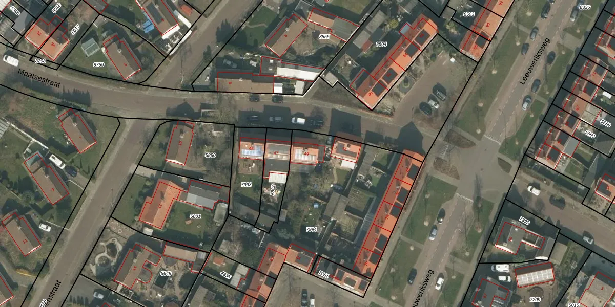 Het perceel waarop Maatsestraat 49 staat heeft een oppervlakte van 1842 m². Dit is een zeer groot perceel. De perceeloppervlakte wordt geregistreerd door het Kadaster. Gedetailleerde informatie over de maten van dit perceel kunt u vinden in het rapport Kadastrale kaart met maatvoering van Maatsestraat 49.
