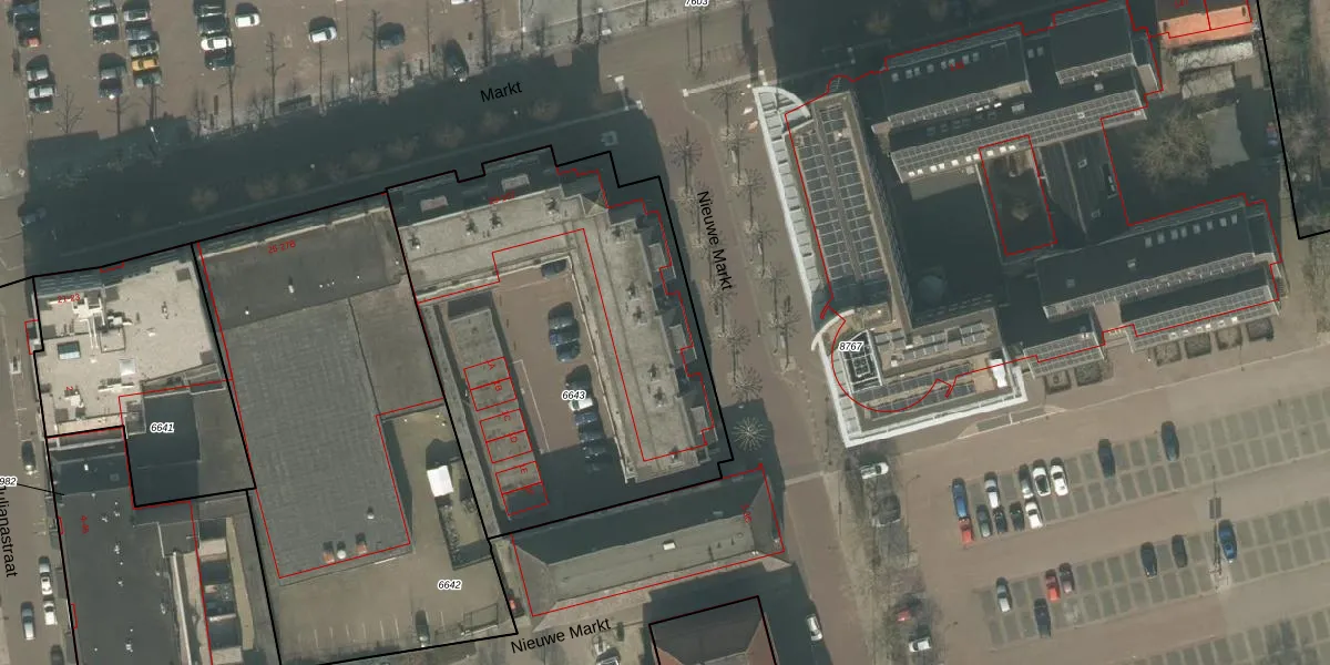 Het perceel waarop Markt 103 staat heeft een oppervlakte van 2082 m². Dit is een zeer groot perceel. De perceeloppervlakte wordt geregistreerd door het Kadaster. Gedetailleerde informatie over de maten van dit perceel kunt u vinden in het rapport Kadastrale kaart met maatvoering van Markt 103.