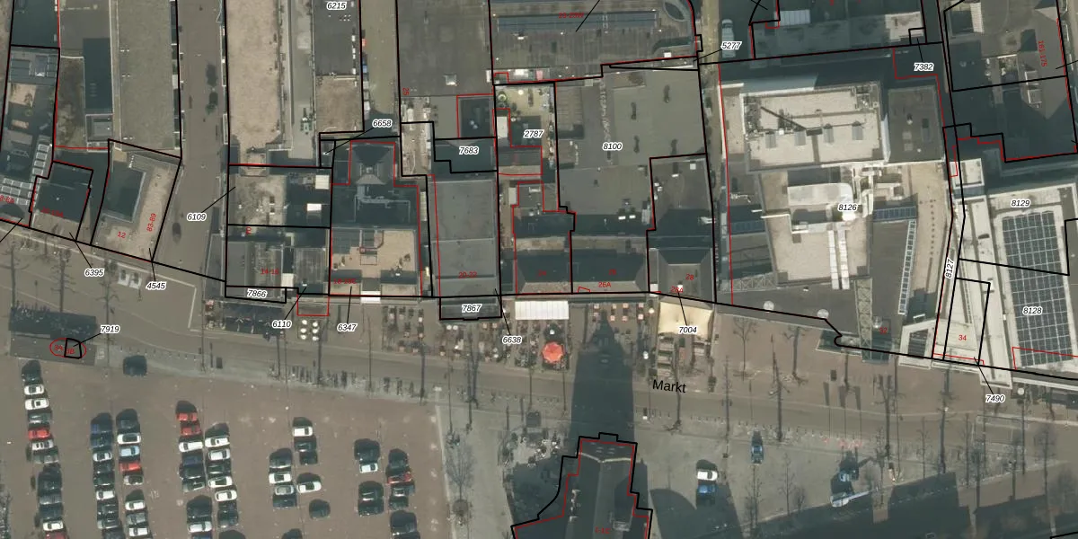 Het perceel waarop Markt 24-A staat heeft een oppervlakte van 480 m². Dit is een groot perceel. De perceeloppervlakte wordt geregistreerd door het Kadaster. Gedetailleerde informatie over de maten van dit perceel kunt u vinden in het rapport Kadastrale kaart met maatvoering van Markt 24-A.
