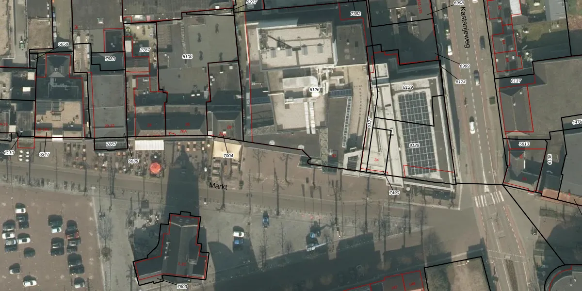 Het perceel waarop Markt 32 staat heeft een oppervlakte van 2267 m². Dit is een zeer groot perceel. De perceeloppervlakte wordt geregistreerd door het Kadaster. Gedetailleerde informatie over de maten van dit perceel kunt u vinden in het rapport Kadastrale kaart met maatvoering van Markt 32.