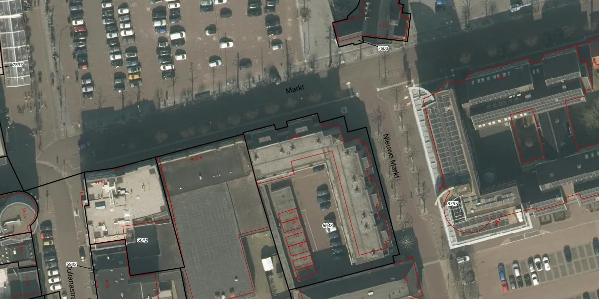 Het perceel waarop Markt 51 staat heeft een oppervlakte van 2082 m². Dit is een zeer groot perceel. De perceeloppervlakte wordt geregistreerd door het Kadaster. Gedetailleerde informatie over de maten van dit perceel kunt u vinden in het rapport Kadastrale kaart met maatvoering van Markt 51.