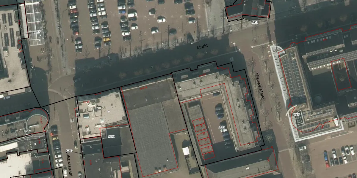 Het perceel waarop Markt 55 staat heeft een oppervlakte van 2082 m². Dit is een zeer groot perceel. De perceeloppervlakte wordt geregistreerd door het Kadaster. Gedetailleerde informatie over de maten van dit perceel kunt u vinden in het rapport Kadastrale kaart met maatvoering van Markt 55.