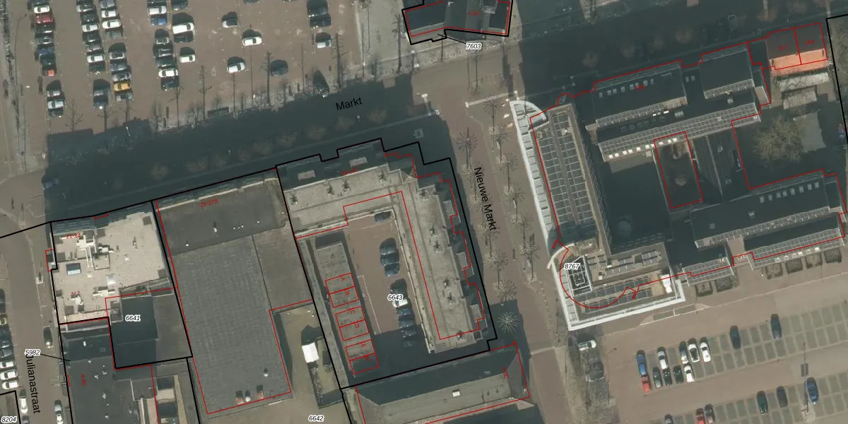 Het perceel waarop Markt 59 staat heeft een oppervlakte van 2082 m². Dit is een zeer groot perceel. De perceeloppervlakte wordt geregistreerd door het Kadaster. Gedetailleerde informatie over de maten van dit perceel kunt u vinden in het rapport Kadastrale kaart met maatvoering van Markt 59.