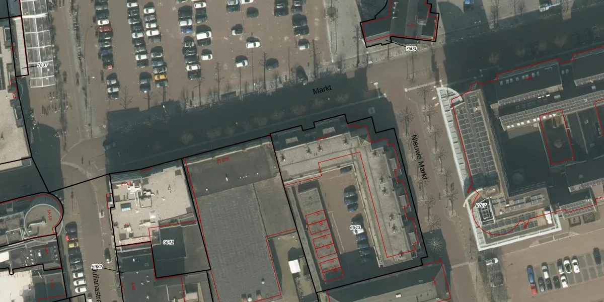Het perceel waarop Markt 73 staat heeft een oppervlakte van 2082 m². Dit is een zeer groot perceel. De perceeloppervlakte wordt geregistreerd door het Kadaster. Gedetailleerde informatie over de maten van dit perceel kunt u vinden in het rapport Kadastrale kaart met maatvoering van Markt 73.